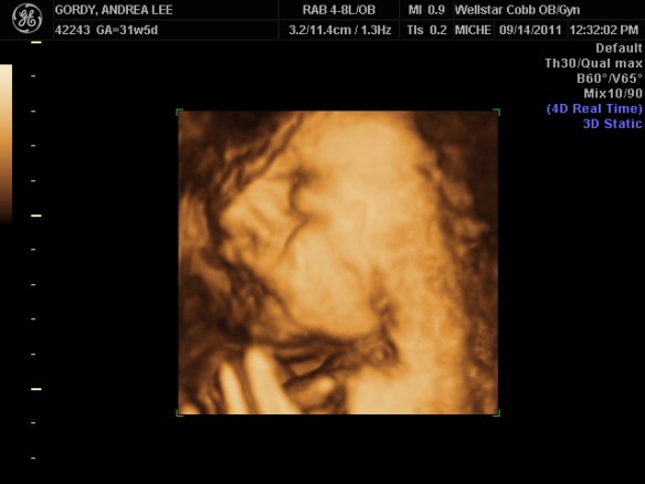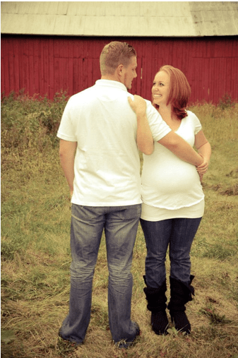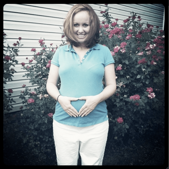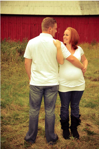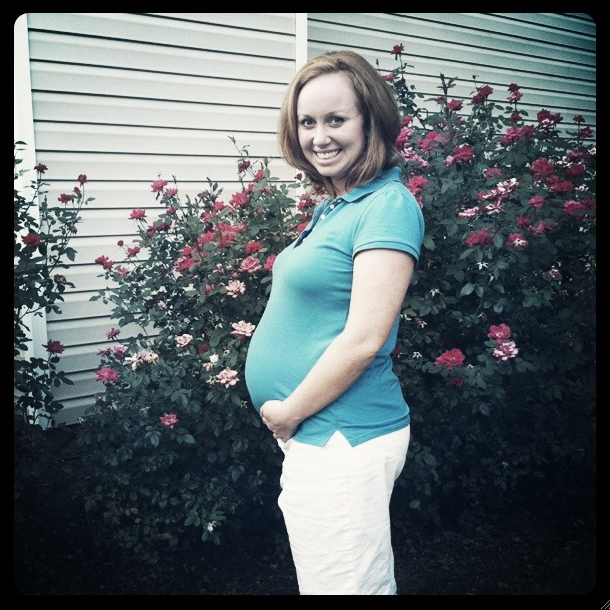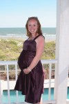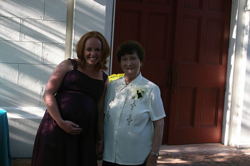 My mom and I went shopping for a dress that would cover my baby bump for the wedding on Monday (FIVE DAYS BEFORE THE WEDDING). I found the perfect, purple satin dress that zipped up nice and easy and I couldn’t WAIT to wear it Saturday. As I put the dress on Saturday afternoon, I quickly realized we had passed the “nice and easy zip” stage, and moved right into the “OH MY GOD, I HOPE THIS DAMN THING WILL ZIP” stage. Fortunately, with a lot of tugging, squeezing, and praying- Mom got me zipped up. I can’t believe he grew so much, so fast– five days?!! As the evening progressed- I heard a lot of comments like- “JEEZ- Every time I look at you, you look bigger!!” I guess Baby had a growth spurt?? Or–it may have had something to do with the fact that within the first ten minutes of the pre-reception, I was on a first name basis with the waiter passing the Hors d’oeuvres. We made a deal that I would be his first and last stop each way out of the kitchen. 🙂