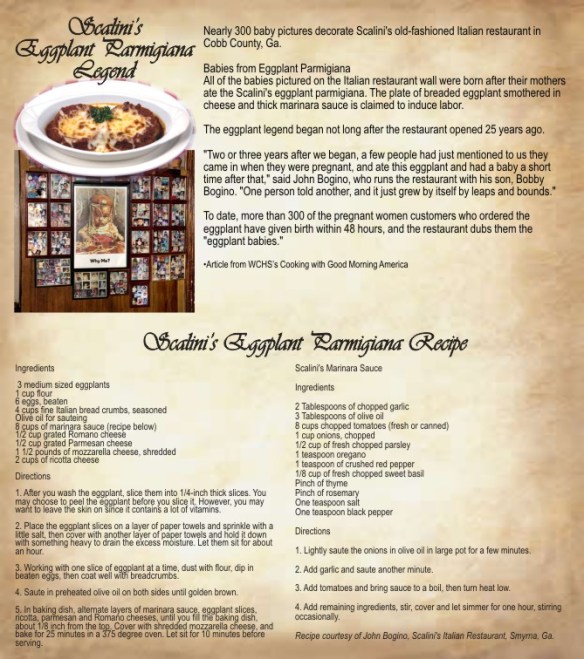 There is a famous restaurant in Atlanta known for their Eggplant Parmesan recipe. For 25 years, it has been known to induce labor! To date, more than 300 of the pregnant women customers who ordered the eggplant parmesan have given birth within 48 hours, and the restaurant dubs them the “eggplant babies.”