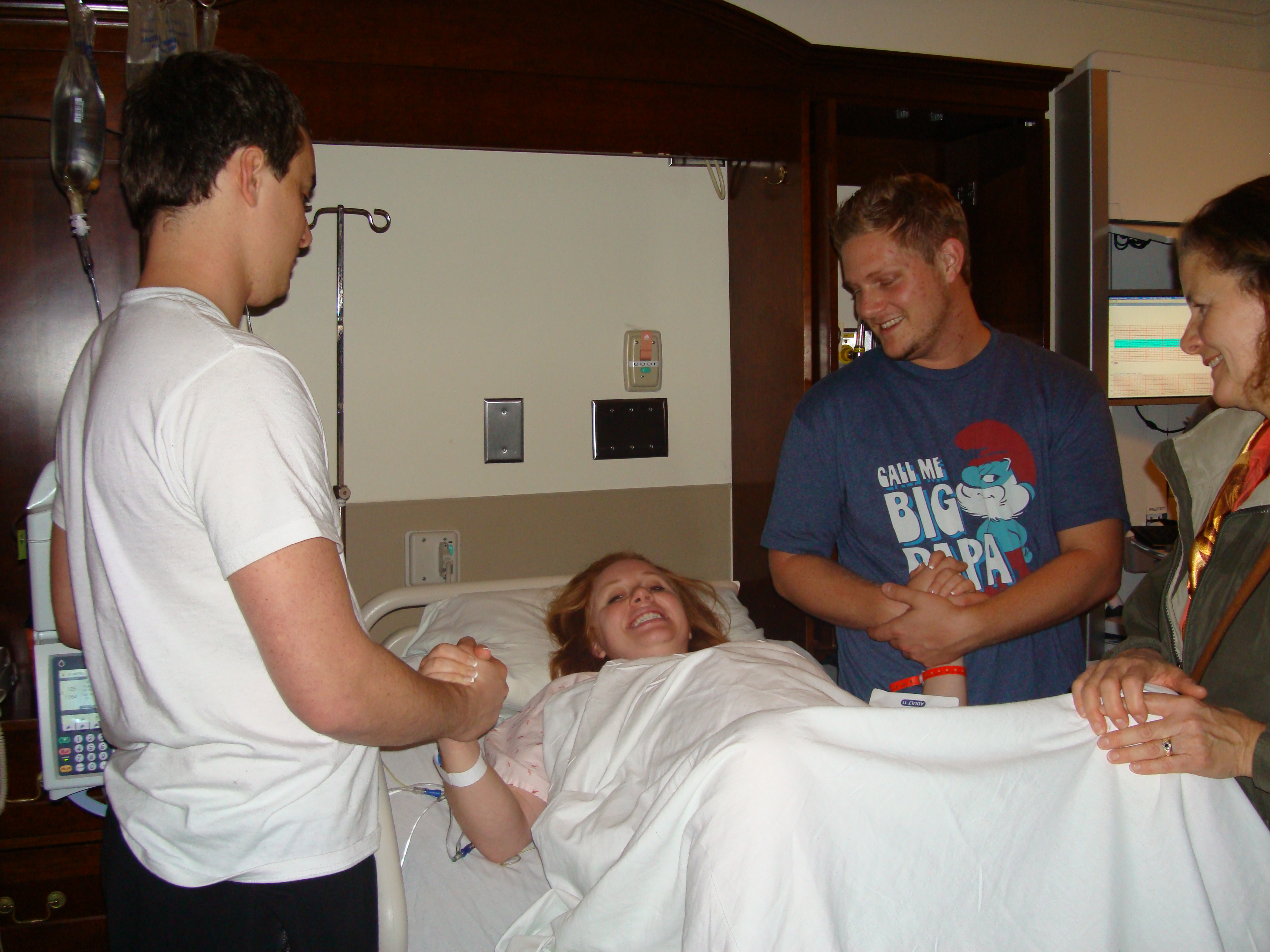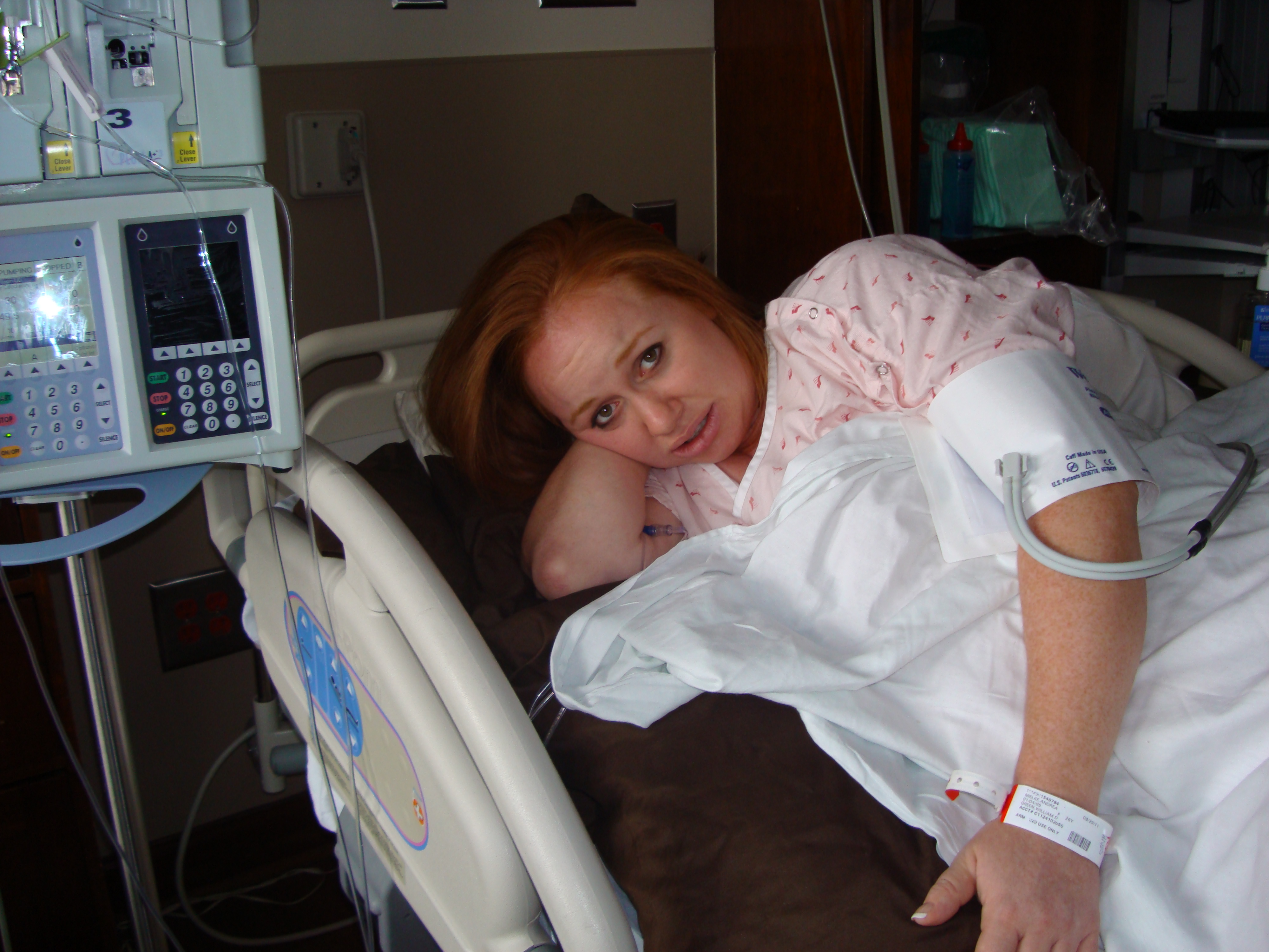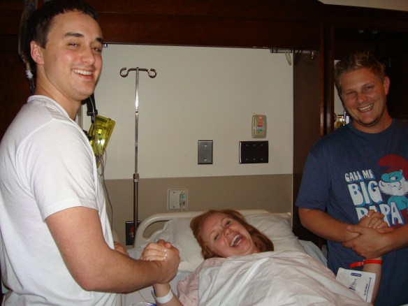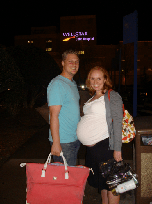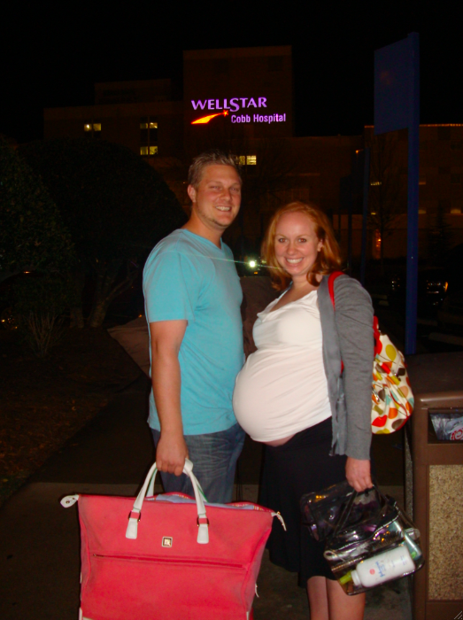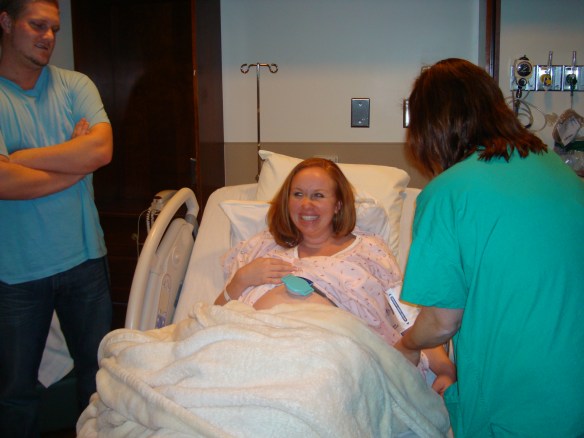 It was then time for the nurses to start my IV and for the Cervidil to be inserted behind my cervix.  My midwife told me a few weeks prior that this would be painful, so I was afraid.  It turned out that it wasn’t any different than all of the other internal exams, so my fears were unwarranted. The nurse explained the process and broke the horrible news that often times being induced takes 2 or 3 days. She told me not to be discouraged if the Cervidil didn’t do what it was supposed to do during the first twelve hours, we might have to repeat the process. I was told I couldn’t eat anything for two hours after they placed the Cervidil, then I would have one hour to eat something light, then I wouldn’t be able to eat anything again until after the baby was born.  Cason went out and bought chocolate glazed doughnuts for me.  Then it was time to play the waiting game.  Ian’s parents arrived around midnight and we all hung out and laughed and talked until about 1:00am. Everyone decided to spend the night at the hotel across the street from the hospital in case they needed to get back to the hospital quickly.  Ian and I tried to get sleep- but in the middle of the night I was having pretty intense contractions (which was a great sign that the Cervidil was working) and got a pain pill.  Besides the nurses waking me up every hour to adjust my monitors so they could hear the baby’s heartbeat, I slept until morning.
