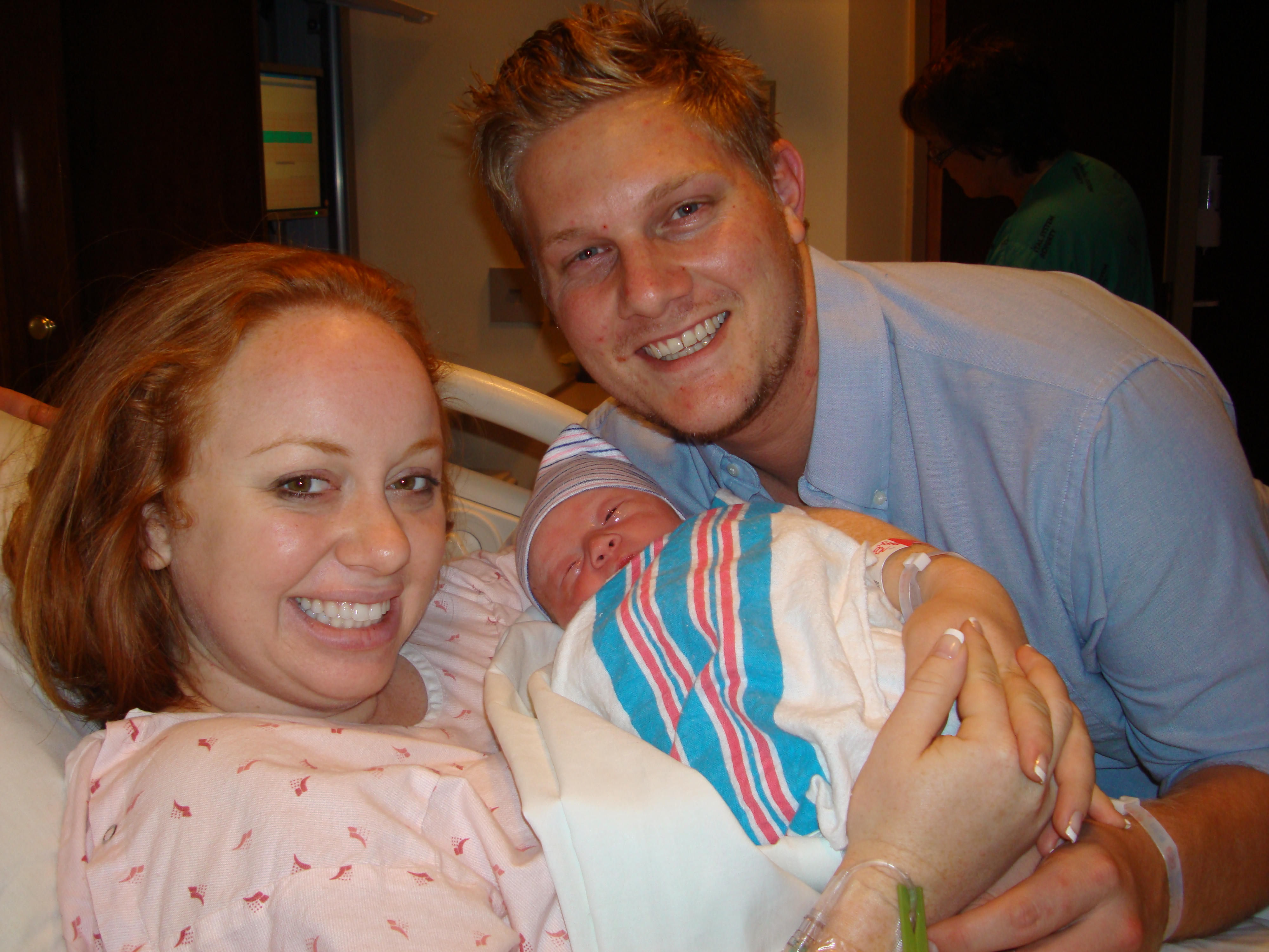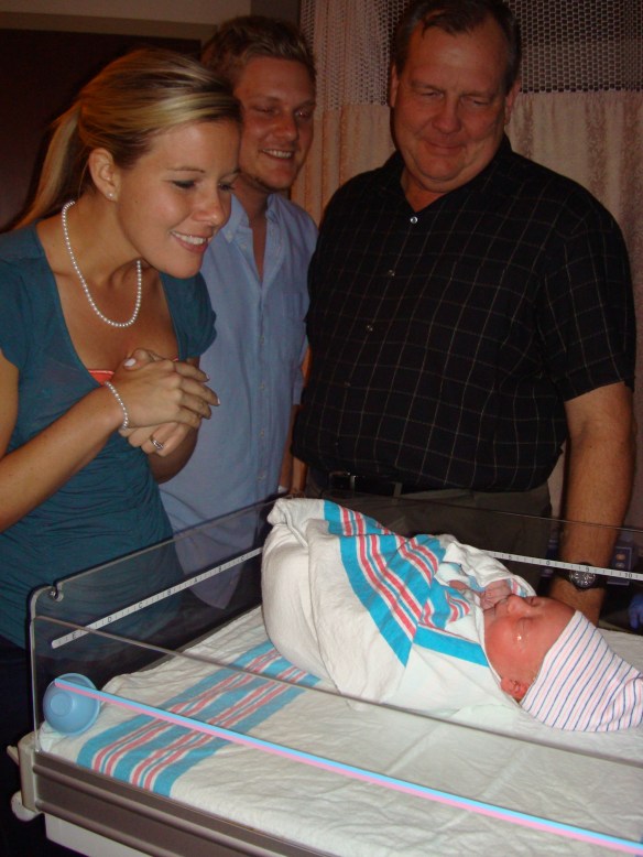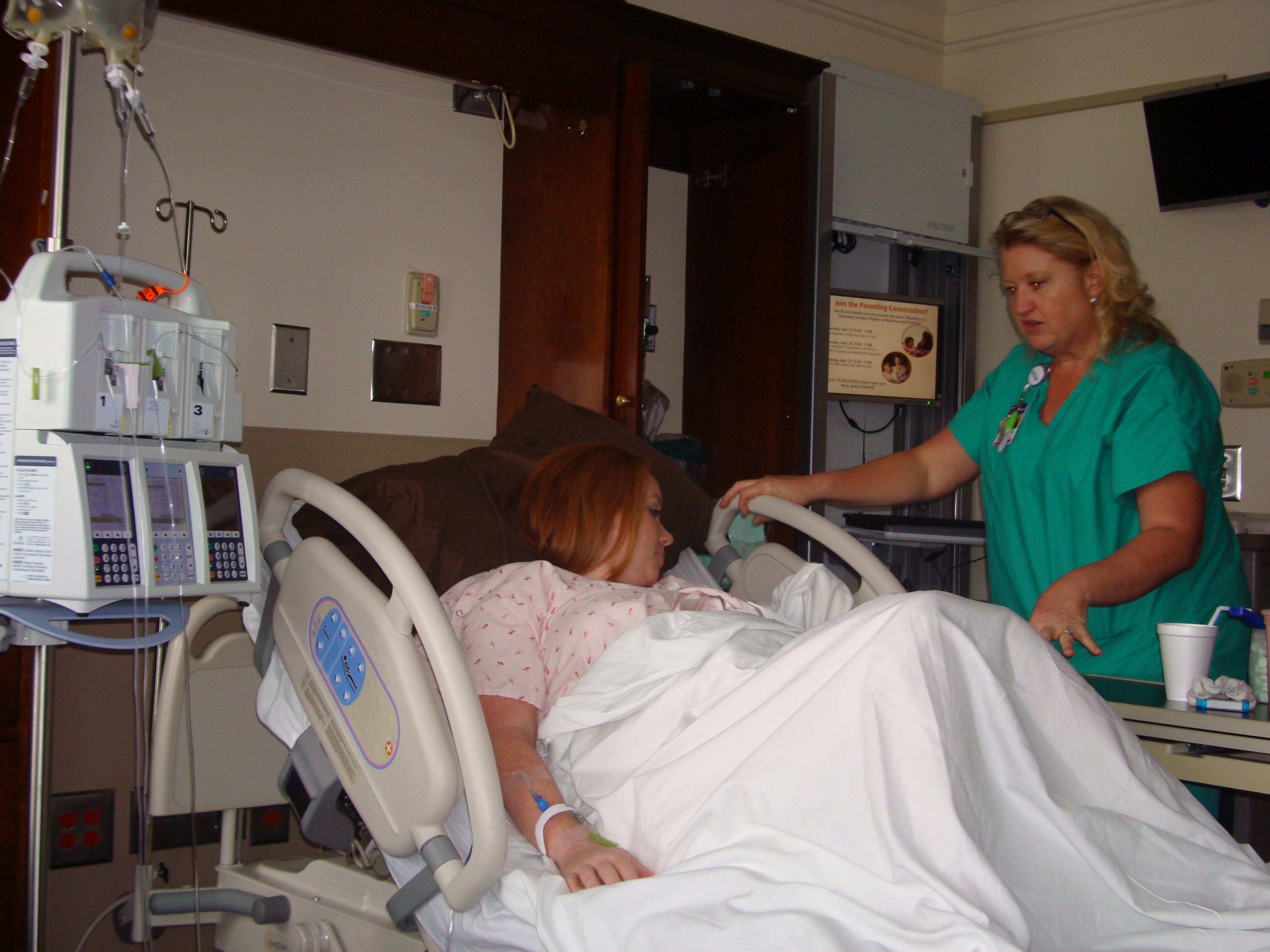 It was then time for the nurses to start my IV and for the Cervidil to be inserted behind my cervix.  My midwife told me a few weeks prior that this would be painful, so I was afraid.  It turned out that it wasn’t any different than all of the other internal exams, so my fears were unwarranted. The nurse explained the process and broke the horrible news that often times being induced takes 2 or 3 days. She told me not to be discouraged if the Cervidil didn’t do what it was supposed to do during the first twelve hours, we might have to repeat the process. I was told I couldn’t eat anything for two hours after they placed the Cervidil, then I would have one hour to eat something light, then I wouldn’t be able to eat anything again until after the baby was born.  Cason went out and bought chocolate glazed doughnuts for me.  Then it was time to play the waiting game.  Ian’s parents arrived around midnight and we all hung out and laughed and talked until about 1:00am. Everyone decided to spend the night at the hotel across the street from the hospital in case they needed to get back to the hospital quickly.  Ian and I tried to get sleep- but in the middle of the night I was having pretty intense contractions (which was a great sign that the Cervidil was working) and got a pain pill.  Besides the nurses waking me up every hour to adjust my monitors so they could hear the baby’s heartbeat, I slept until morning.