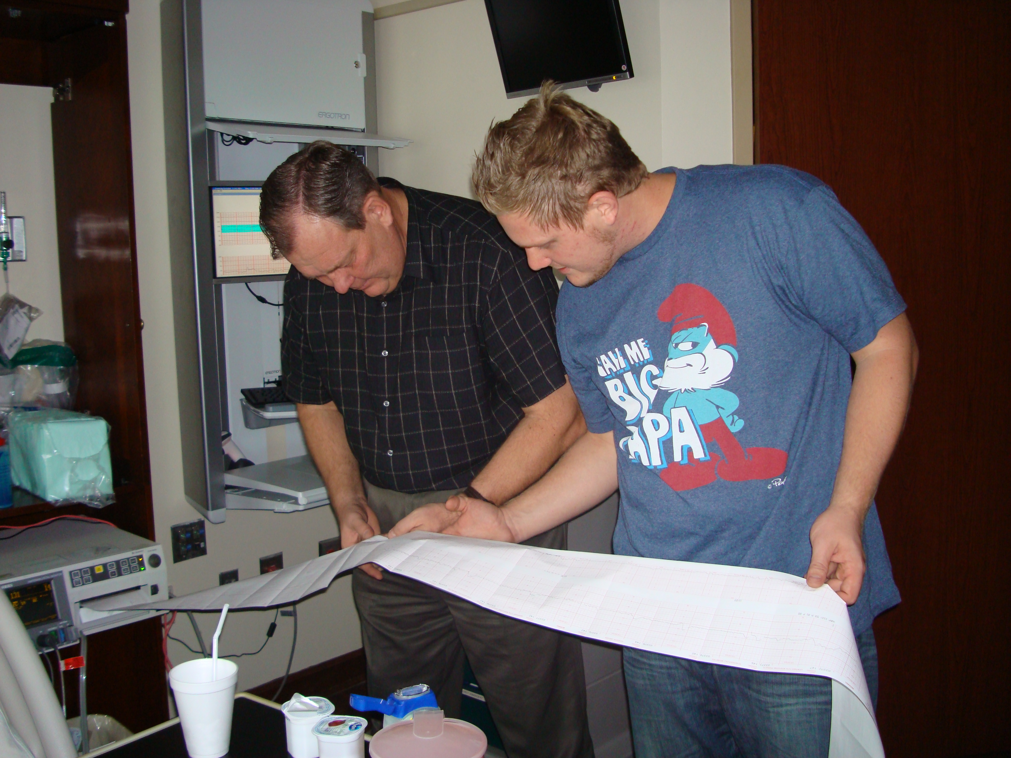 I started having contractions within about 20 minutes of the Pitocin running through my IV. By 1:00pm, the contractions were showing up on the monitors pretty regularly.  Ian’s dad took the role of contraction monitor- letting me know when they were coming, when they were going, and how intense each one was.