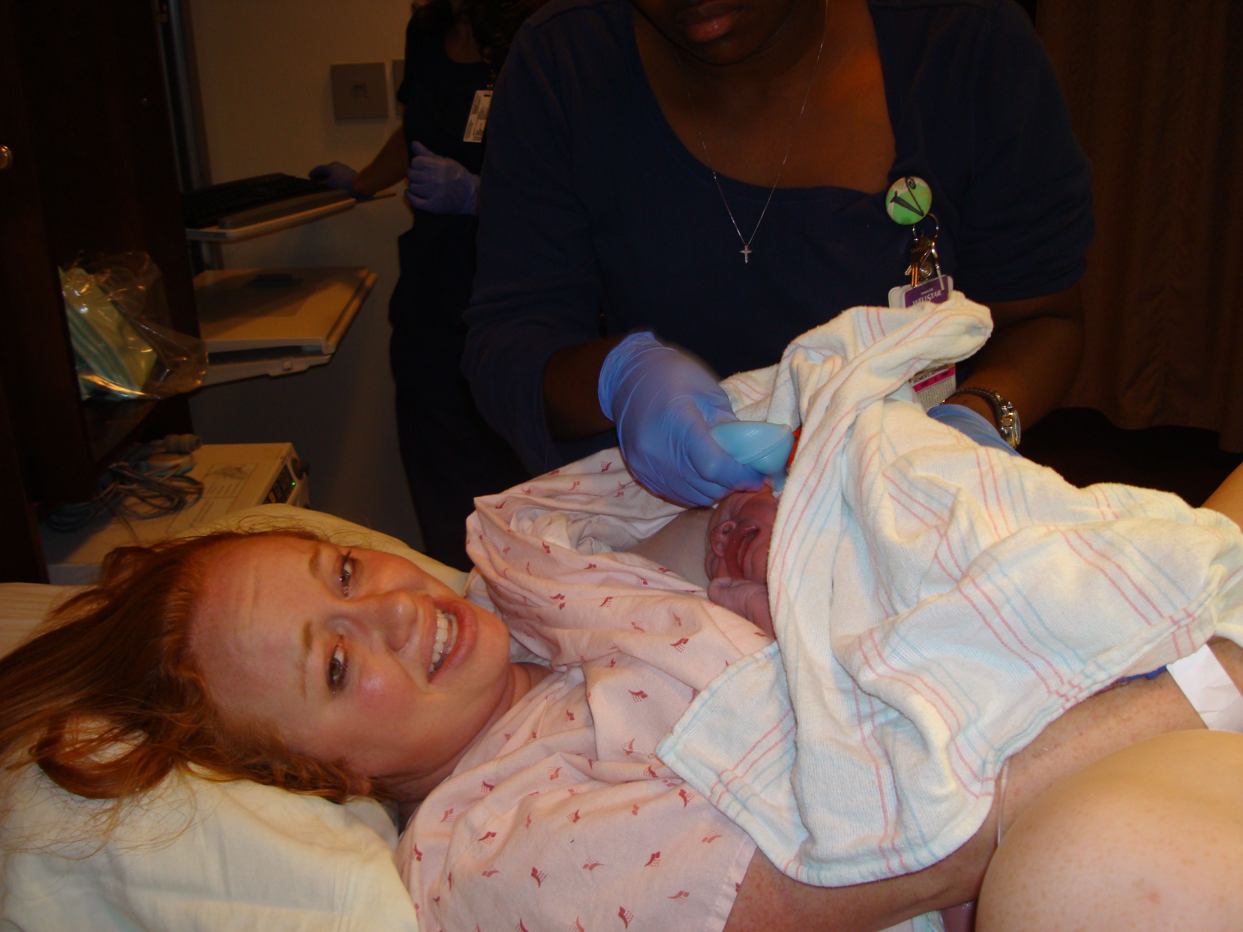 The midwife checked me again and it was time!! I was 10 centimeters dilated!  She decided that it was time to break my water with an instrument that eerily resembled a crochet hook :(. It only took a few moments for the contractions to intensify dramatically  after this procedure and I got my first taste of what the billions of women before me spoke about as if it were a right of passage.  She told me to “labor down” for a while- which means even though your body is telling you to push, you refrain and just let the contractions do it for you.  Ummm… YEAH RIGHT!  My body was pushing and there wasn’t a damn thing I (or anyone else for that matter) could do about it.  I pushed harder than I ever thought possible… Ian said I turned blue, I couldn’t catch my breath, I broke the blood vessels around my eyes, and my eyes popped out of my head like a frog and stayed that way for 3 days.