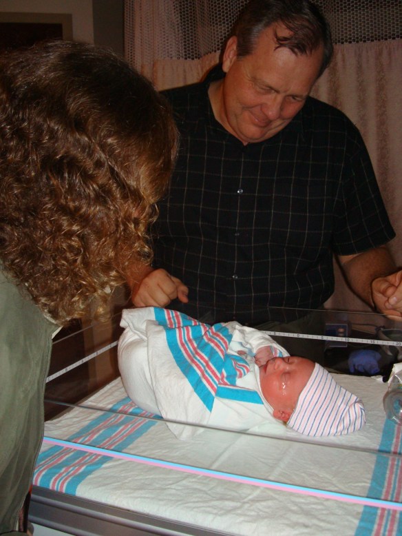 Finally, Georgia (the midwife), declared that she could see his head and I could put my hand down there and touch him.  It was the most incredible feeling and it provided me with the last boost of energy that I needed to push him out.    Georgia instructed Mom and Ian to each grab my legs. After an hour of true labor and pushing, Georgia grew concerned about the amount of time passing and the short periods when Grae’s heartbeat slowed. Apparently, from her perspective, it was growing increasingly obvious that my son was going to be too large to complete his trip without her intervention. She asked if I was willing to have an episiotomy in hopes that it would help. After a brief, frantic discussion of the pros and cons of this procedure, I determined (ok maybe I wasn’t being objective) that I would in fact hate it if she “epised” me. The next strong contraction set in and suddenly, without warning, she decided that, in spite of my frantic wishes, I would in fact have opted to be given some assistance from her surgical grade scissors if I were in a position to be reasonable.   I was suddenly hit with a huge contraction, and the overwhelming pain came to a peak and then I felt a huge release of pressure- I knew his head was out.  Milliseconds later, another huge contraction hit, intense pressure built up, and I pushed my son from my body.