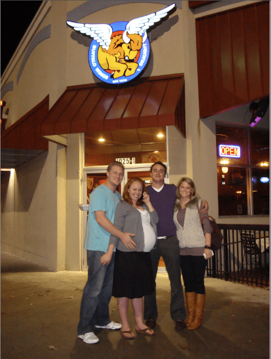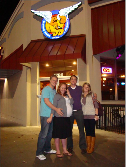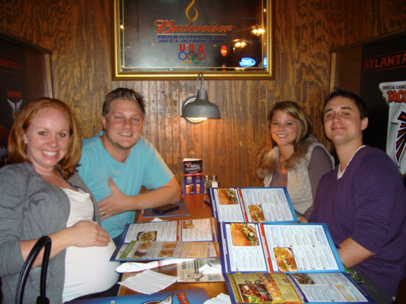 Monday was a very relaxing day.  Ian and I slept in until 10:00, then spent the afternoon finishing up errands and enjoying our last few hours together as a family of two, eating chips and cheese dip at the Mexican restaurant up the road.  Mom arrived in the early evening, and my brother and his girlfriend were not too far behind.  We laughed about my big belly, took a lot of pictures, packed the car up, and went to dinner at Taco Mac.  We referred to this as “The Last Supper.”