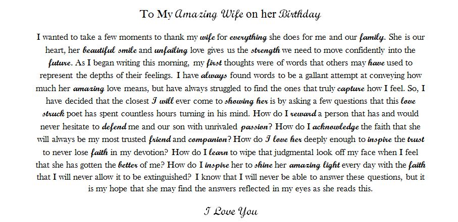To My Amazing Wife on her Birthday Posted on January 4, 2012 by themielkeway Share this:Share Click to share on Pinterest (Opens in new window) Pinterest Click to share on Print & PDF (Opens in new window) Print & PDF Click to share on Facebook (Opens in new window) Facebook Like Loading... Related