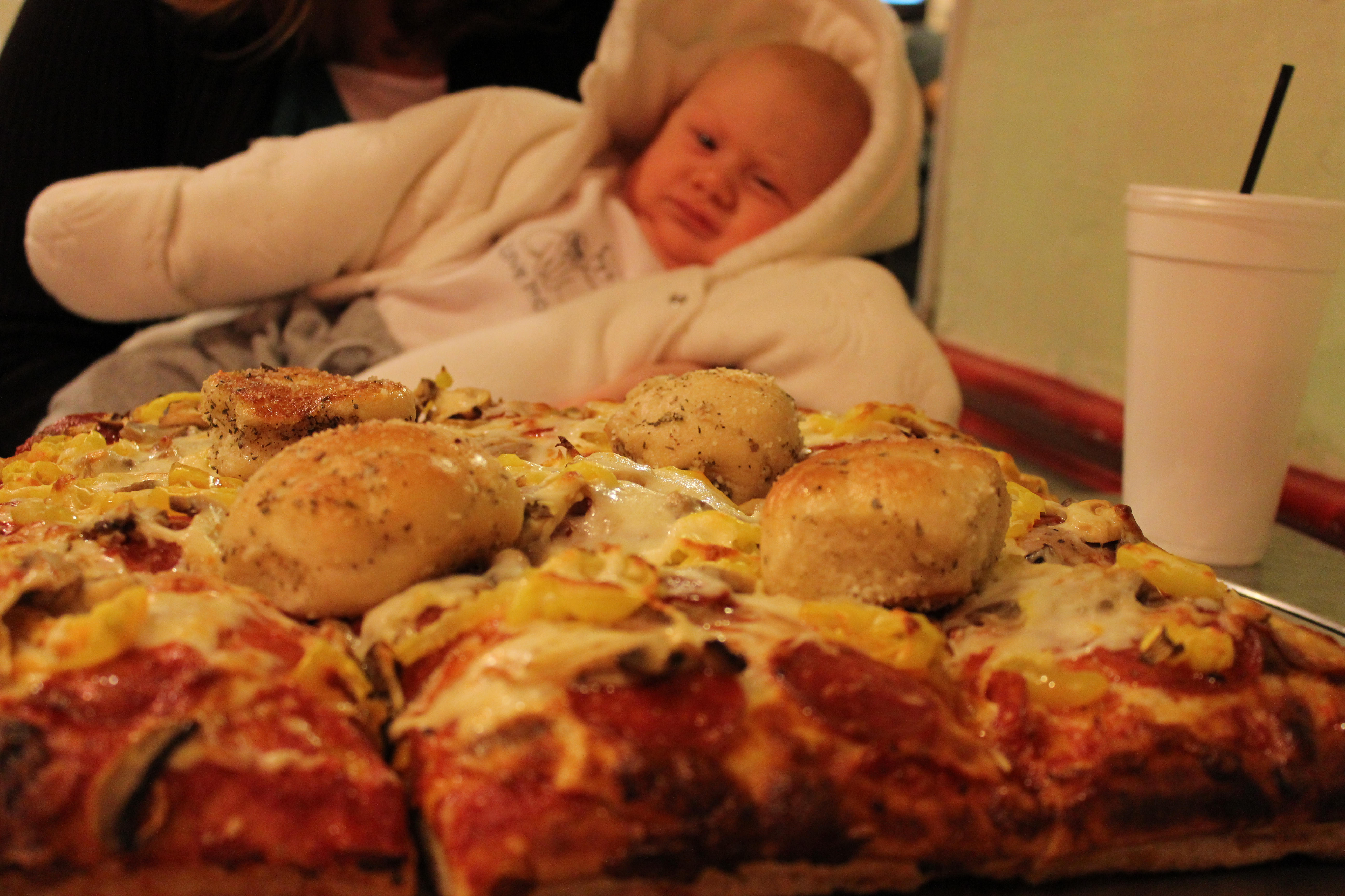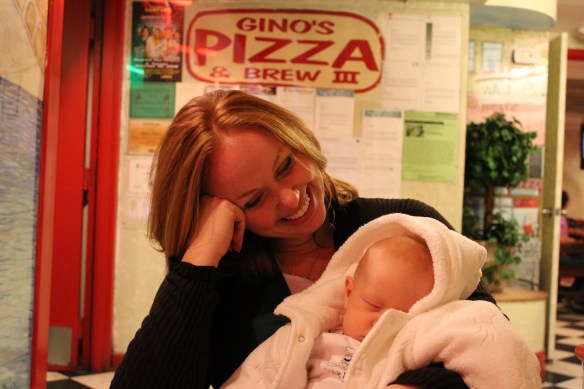 We ate at a delicious pizza place and our pizza was three times the size of Graeson!