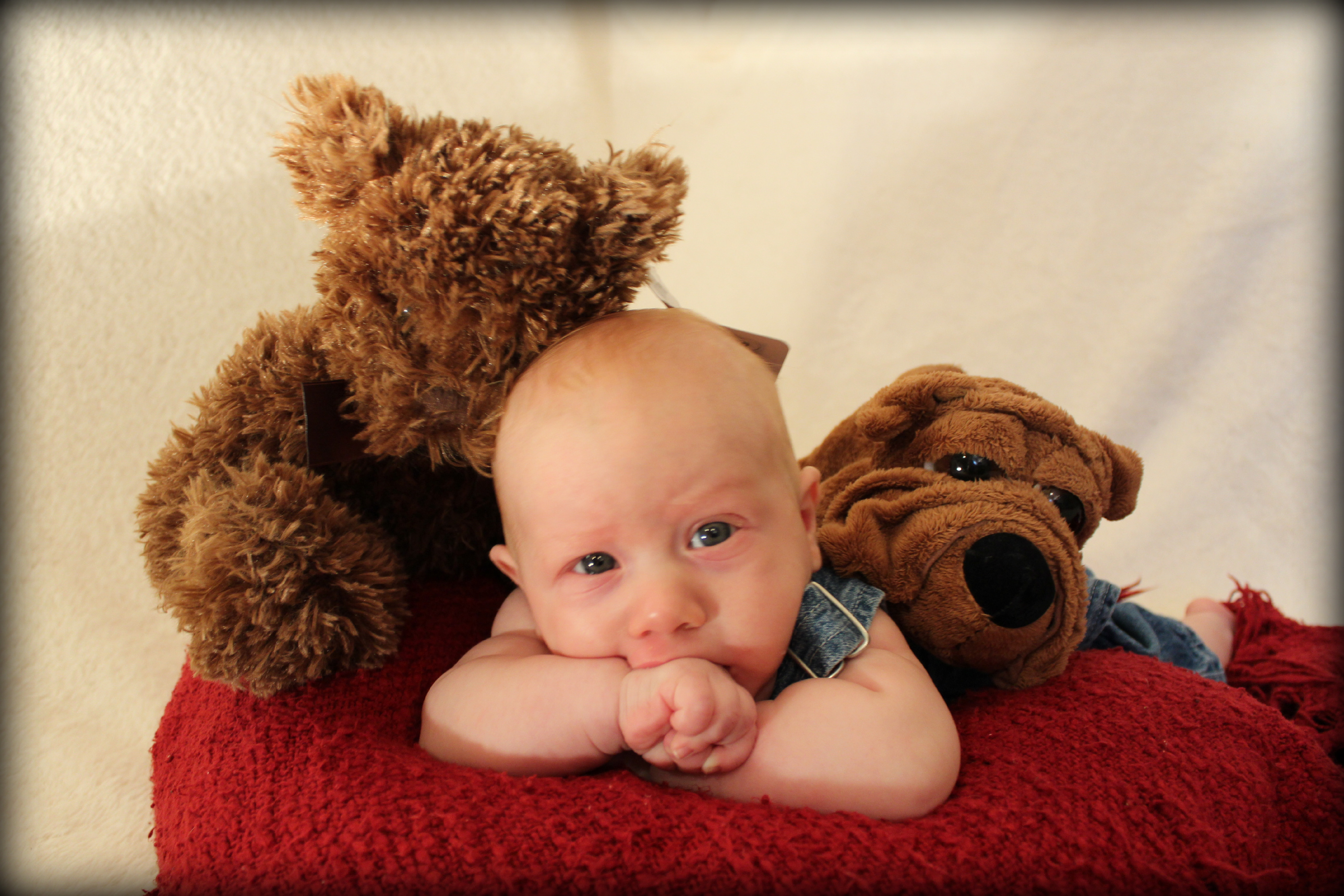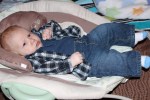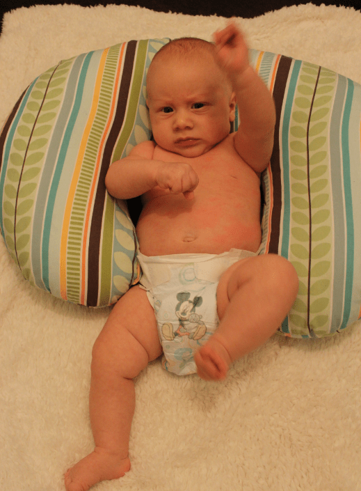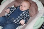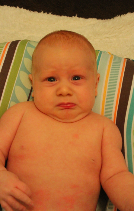 He is staying alert for much longer periods of time, and has a long attention span.  He is completely entertained by his favorite “stations” that we have set up around our house (Johnny Jump Up, Floor mat with lots of toys dangling over his head that he can bat at, a blanket with a ball and rattle for tummy time, and a mirror so he can see the most amazing sight in the world- his face!)  Although, sometimes that baby in the mirror is mean to him and makes him cry. He is even starting to pick up some of his toys!