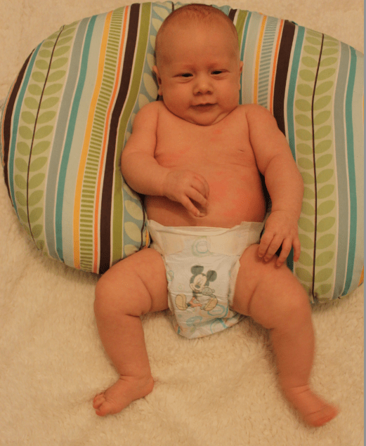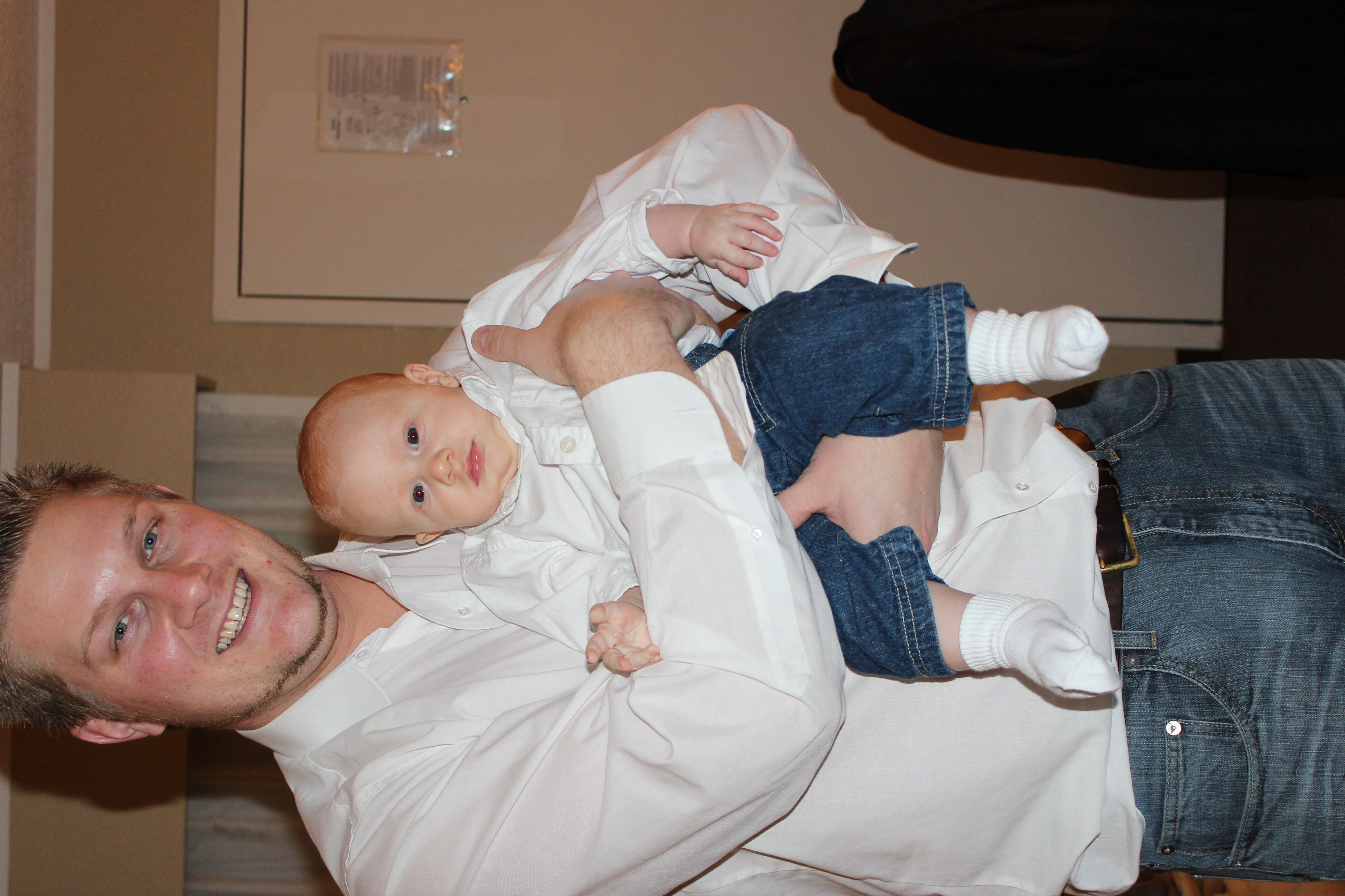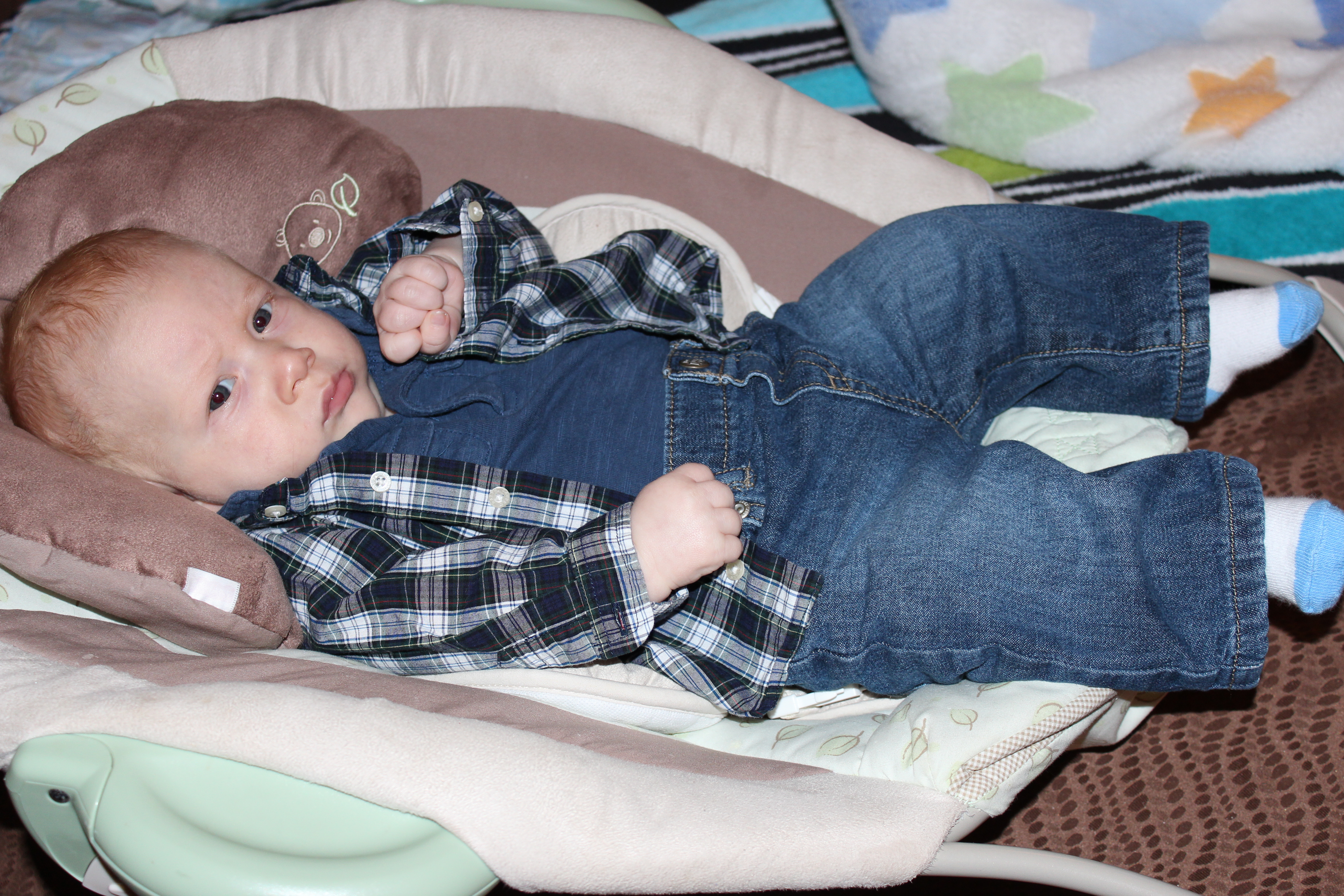 He is doing much better sleeping now.  He either sleeps through the night, or wakes up once between 3:30 and 4:00 am to eat, then usually falls back asleep.  He wakes up again around 7:00 am for another diaper change and some more “num-nums”.  Sometimes he even sleeps in until 9 or 10!