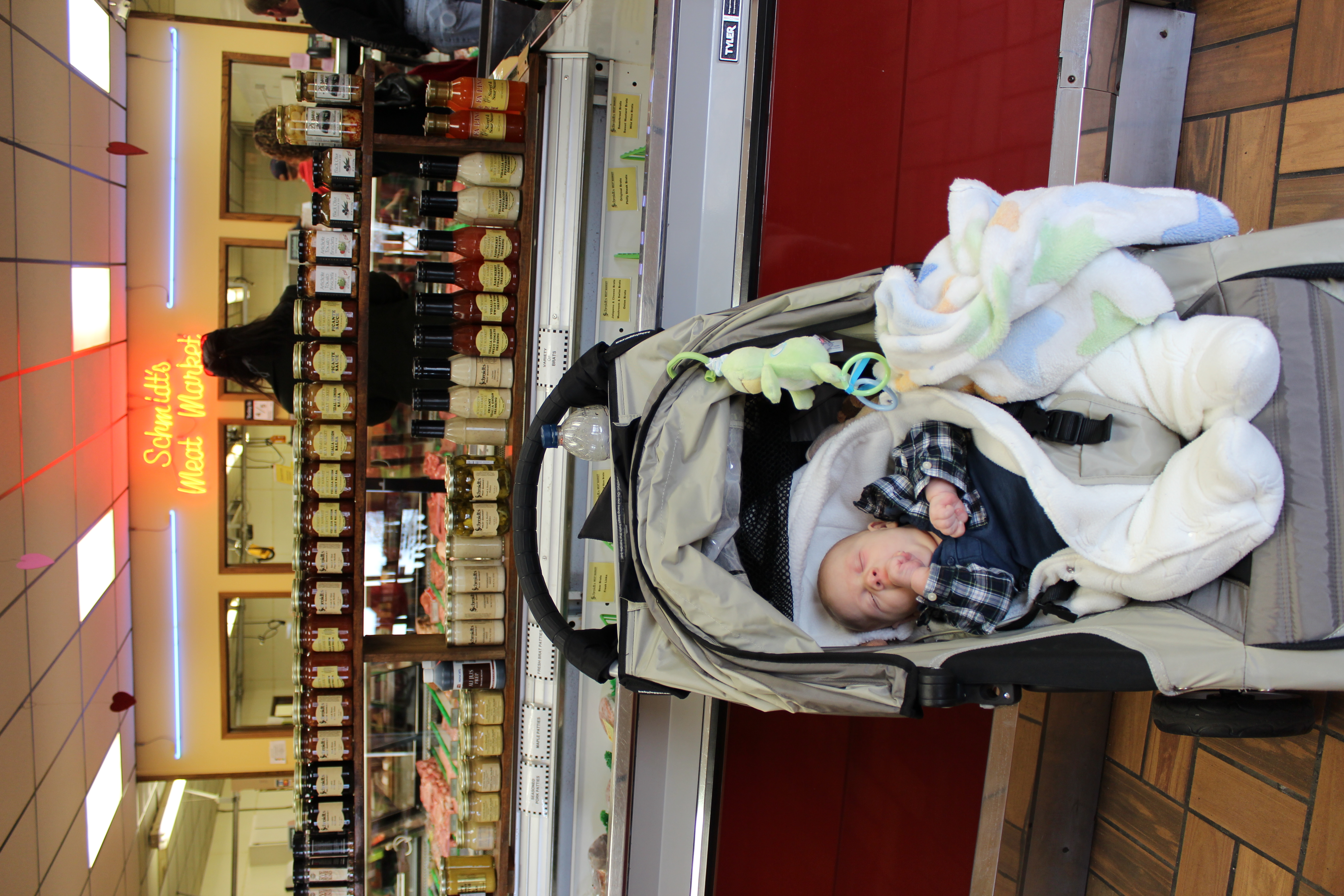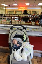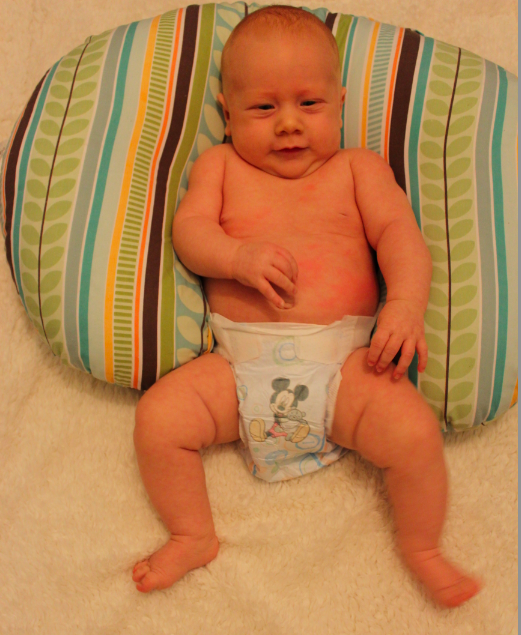 He is about to outgrow his 3-6 month clothes (OH MY GOODNESS, HE IS HUGE), and is now wearing size 3 diapers!  It was highly disturbing buying them, because as I was putting the giant Sam’s Club box of size 3 in my cart, a CHILD was putting his OWN giant box of size 4 diapers in his mom’s shopping cart.  Woah.. I couldn’t believe that he was wearing only ONE SIZE BIGGER THAN MY TWO MONTH OLD INFANT.  EEeks.