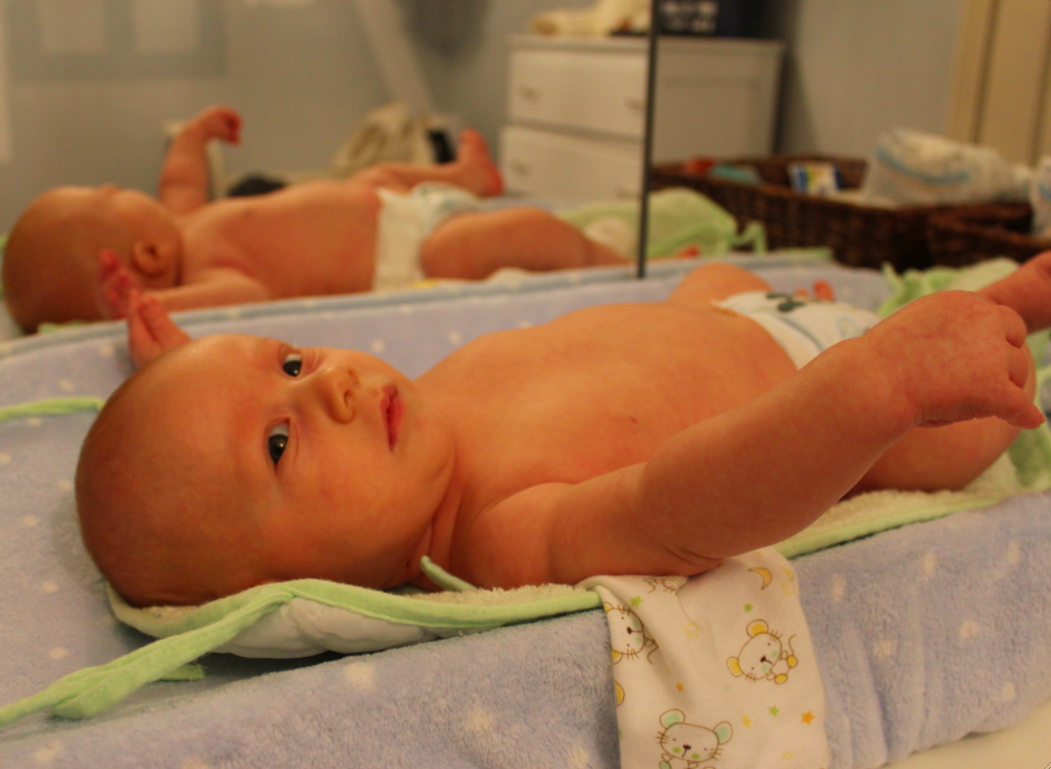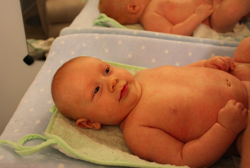 He is beginning to enjoy spending time on his activity mat, cooing at the baby in the mirror. He also is batting at his toys.