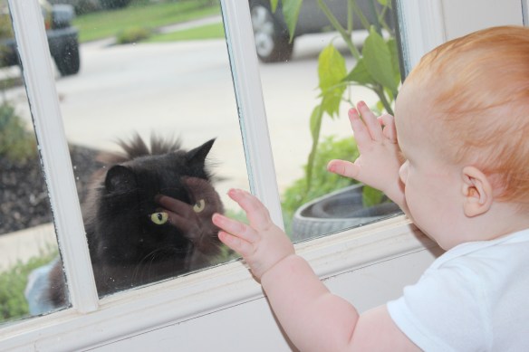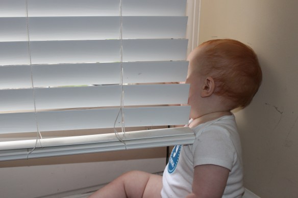 Grae’s newfound pasttime is looking out the window in the front door.  Today, I was curious what he was giggling at, and when I took a peek, it all became a little more clear.  🙂