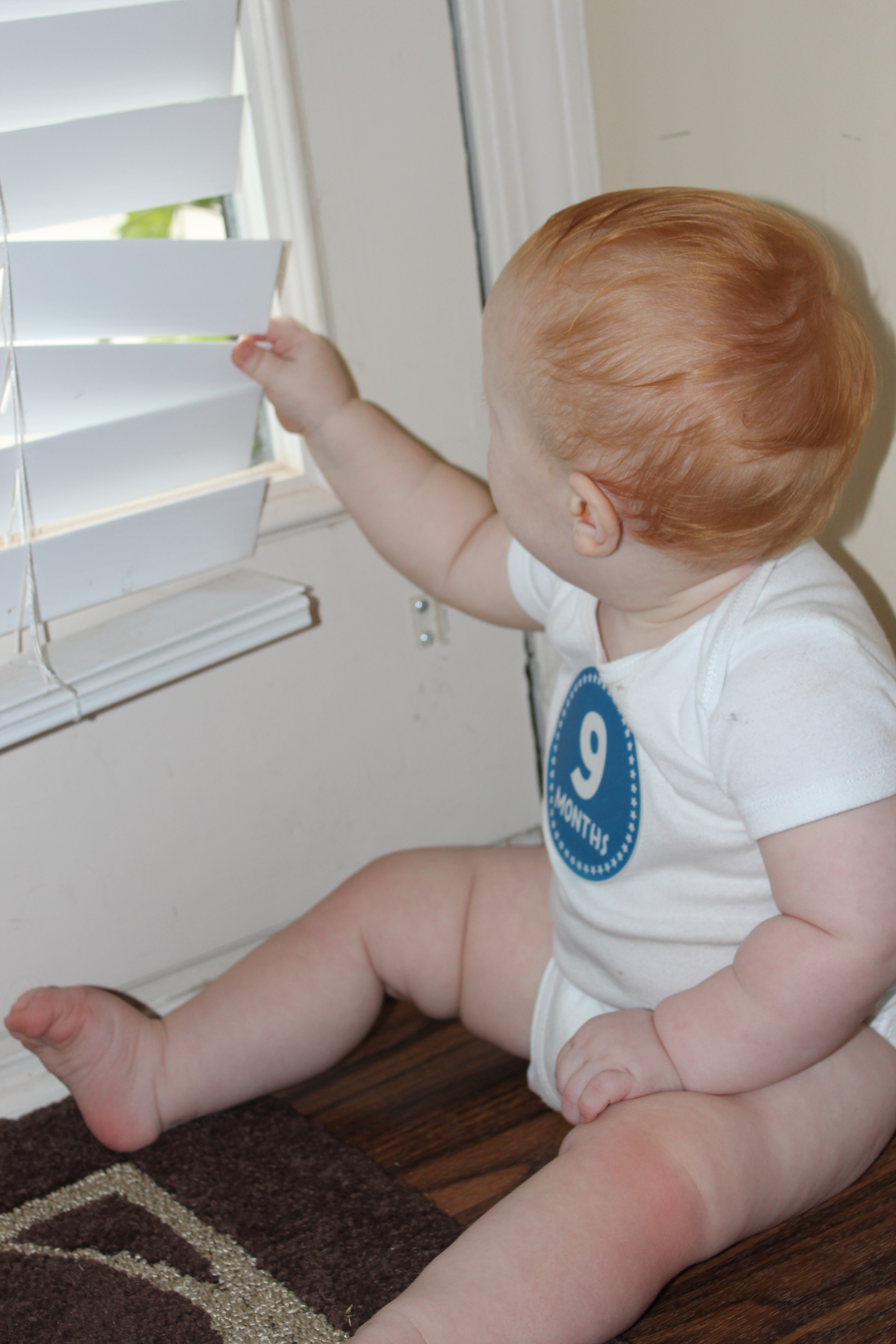 Wow, in all nine months of your precious little life, this has been the week with the most changes!  You are FULLY mobile and we can’t keep up with you!  And, let me tell you, you are pleased as punch with your newfound independence.     You love throwing your big blue ball down the hall then crawling after it as fast as you can. When you catch up to it, you turn around to look at us, grinning like a Cheshire cat.