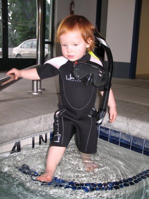 Well, it all starts by lashing about five good sized inflatable rafts together, then we float out (as a family) into the middle of the river. After finding a spot where the current is weak, we “Gear Up Grae.” This consists of a baby scuba set complete with a tiny chain mail suit. After we make sure the O2 is flowing well (responsible parents that we are), a small rope is placed around his left ankle and he is lowered into the water. Then WAM!!!! He gets one every time, that’s my boy!! Last week he pulled up a 73 pound Giant Cat Fish. THAT’S MY LITTLE NOODLER!! 🙂