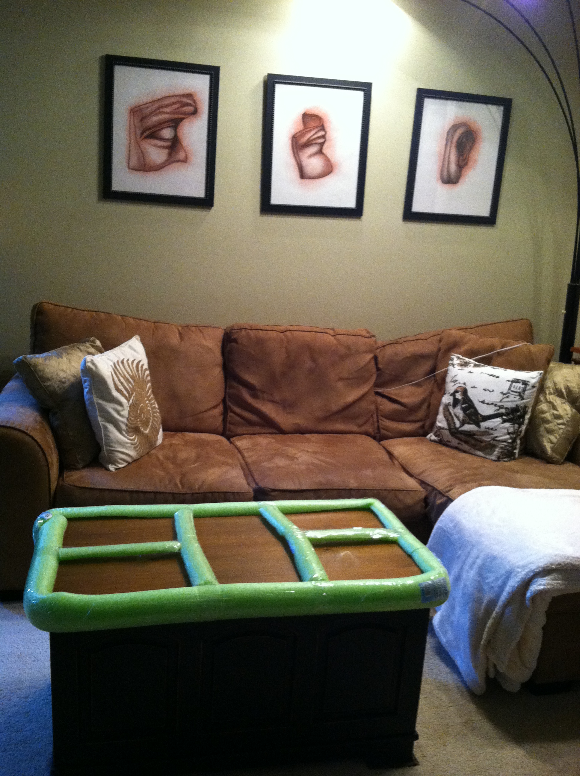 Instead, we went out and bought a bunch of Pool Noodles (various neon colors, of course), cut them in half, and are using packing tape to attach them to every possible threatening piece of furniture in our house, using the motto: “you can never be too careful.” We’ll just tell people we formed our decorating style watching Color Splash: Miami.  😉