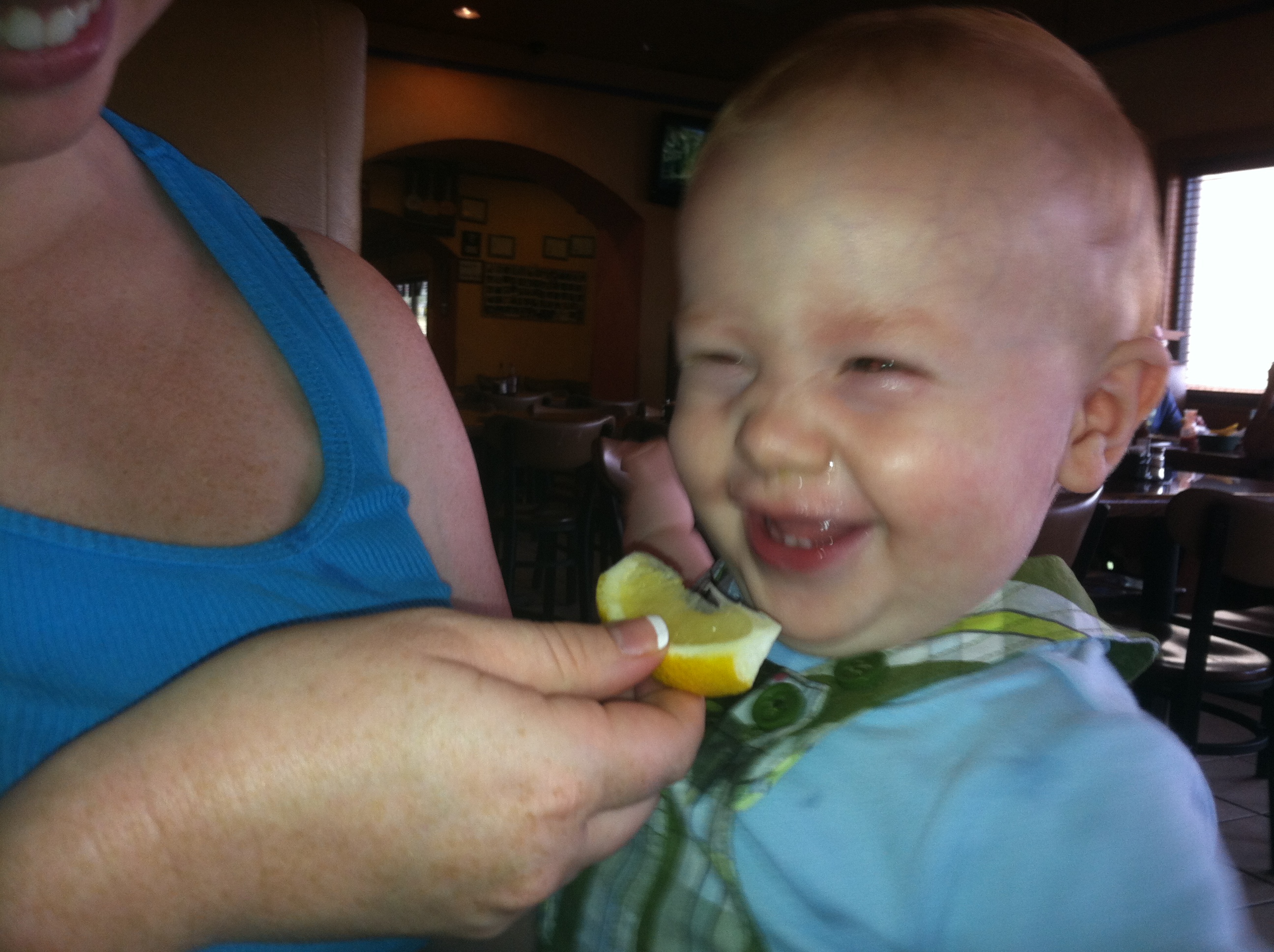 It is kind of a Mommy’s right to laugh at Baby’s funny faces when he tries new foods, right? Well, even if I have a sick and twisted sense of humor, I had been looking forward to it for quite some time. However, Grae has been eating solids for almost three months now, and I have yet to get a real good funny face. So, I decided to turn up the volume and give my poor, unsuspecting baby a lemon to munch on. As I waited in giddy anticipation for a perfect pucker, he licked it, inspected it, then went right back to slurping and nibbling it as if it was candy, like he was just so grateful we finally gave him something with a little flavor! WHAT?!!