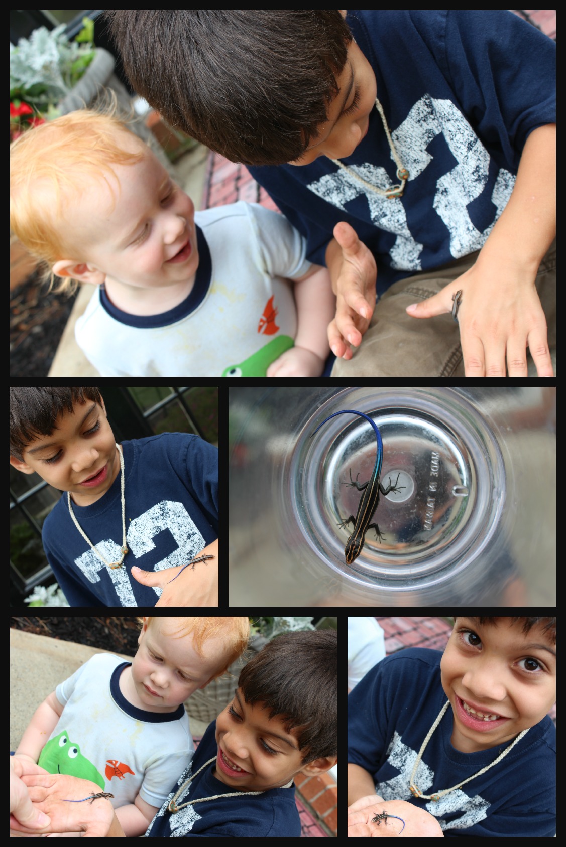It has been wet and rainy all week- which means a lot of playing inside (read: two stir crazy little boys). As we were coming downstairs this morning, RJ started excitedly screaming, “Mommy!! Mommy! Can we keep it?!!” As my heart dropped (because God only knows what that child was talking about- and my thoughts went flying directly into how am I going to get rid of the racoon, mouse, squirrel, etc that invaded our home..), I was thrilled to find the cutest baby lizard in our entryway. We played with this little guy for hours. What is it about little boys and lizards?! How fun!