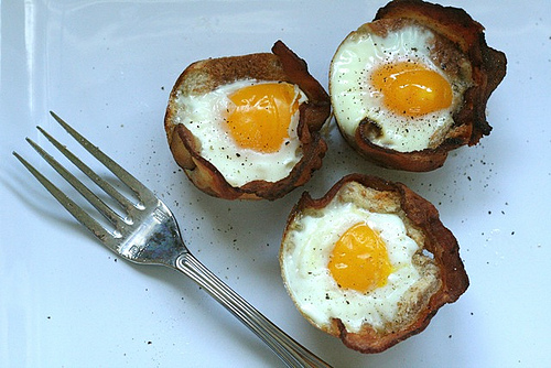 What a fantastic idea–bacon, eggs and toast all wrapped up in a cute little muffin-sized package.